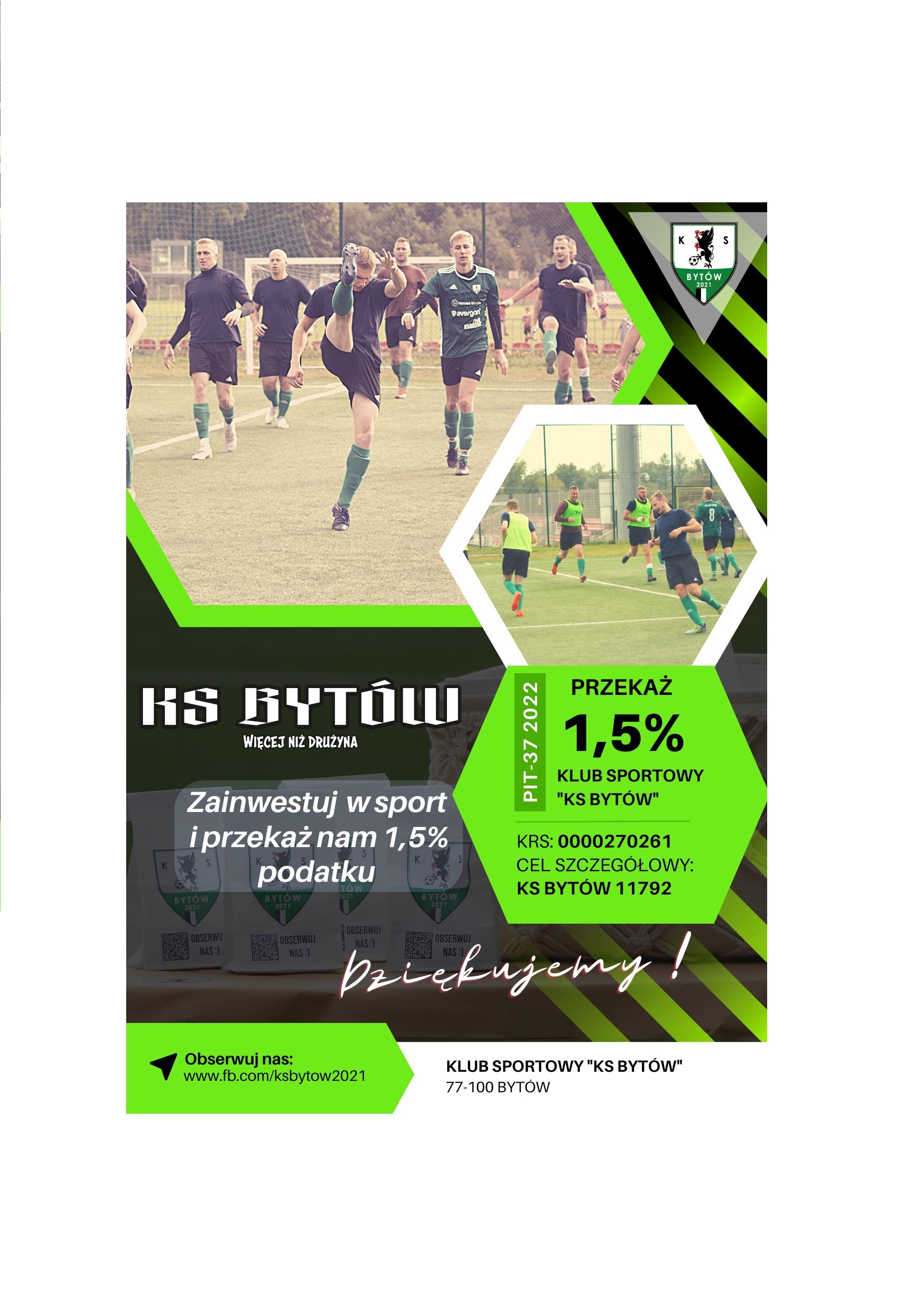 Przekaż 1,5% podatku na KRS: 0000270261 z celem szczegółowym: KS Bytów 11792